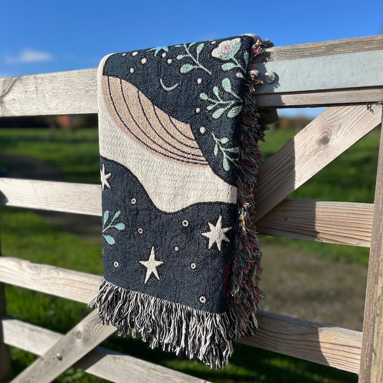 Wrap yourself in the tranquil embrace of the sea with our "Under Moon & Tide" blanket. Featuring gracefully swimming whales beneath a crescent moon, this blanket is a cozy tribute to the calming beauty of ocean nights.Â